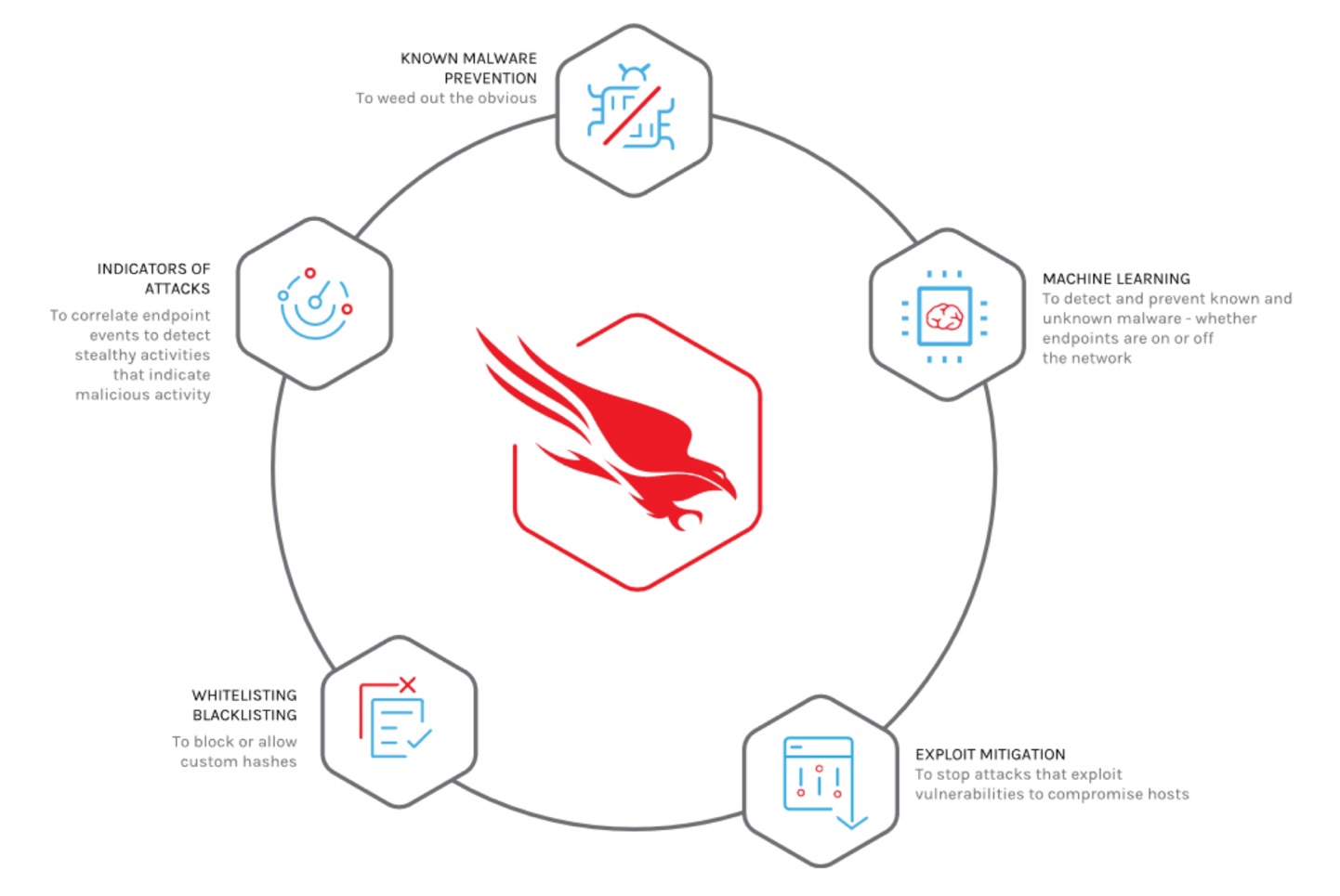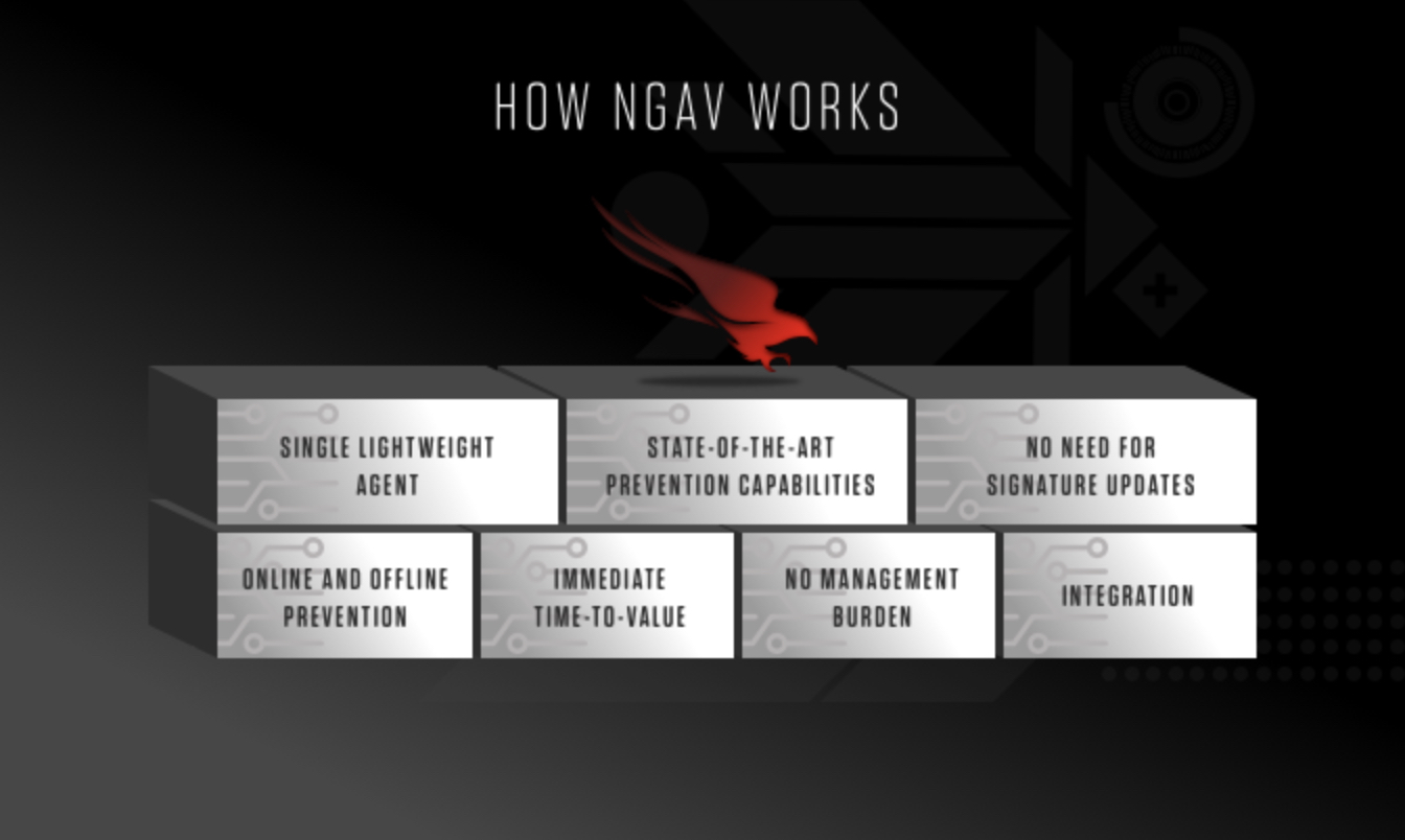 Next-Generation Antivirus (NGAV) uses a combination of artificial intelligence, behavioral detection, machine learning algorithms, and exploit mitigation, so known and unknown threats can be anticipated and immediately prevented. NGAV is cloud-based, which allows it to be deployed in hours instead of months, and the burden of maintaining software, managing infrastructure, and updating signature databases is eliminated