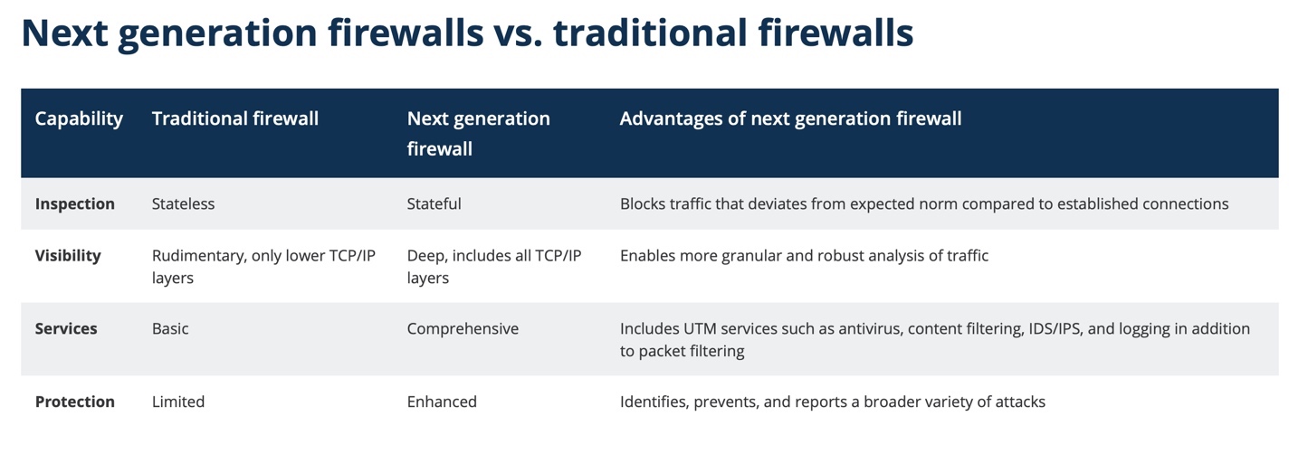 - Enhanced protection against cyber threats — Next gen firewalls can inspect and analyze traffic more comprehensively than traditional firewalls, which helps them detect and prevent a greater variety of cyber attacks than a traditional firewall. For example, next gen firewalls can detect traffic maliciously targeting the network and prevent the intrusion by quarantining or blocking the traffic.