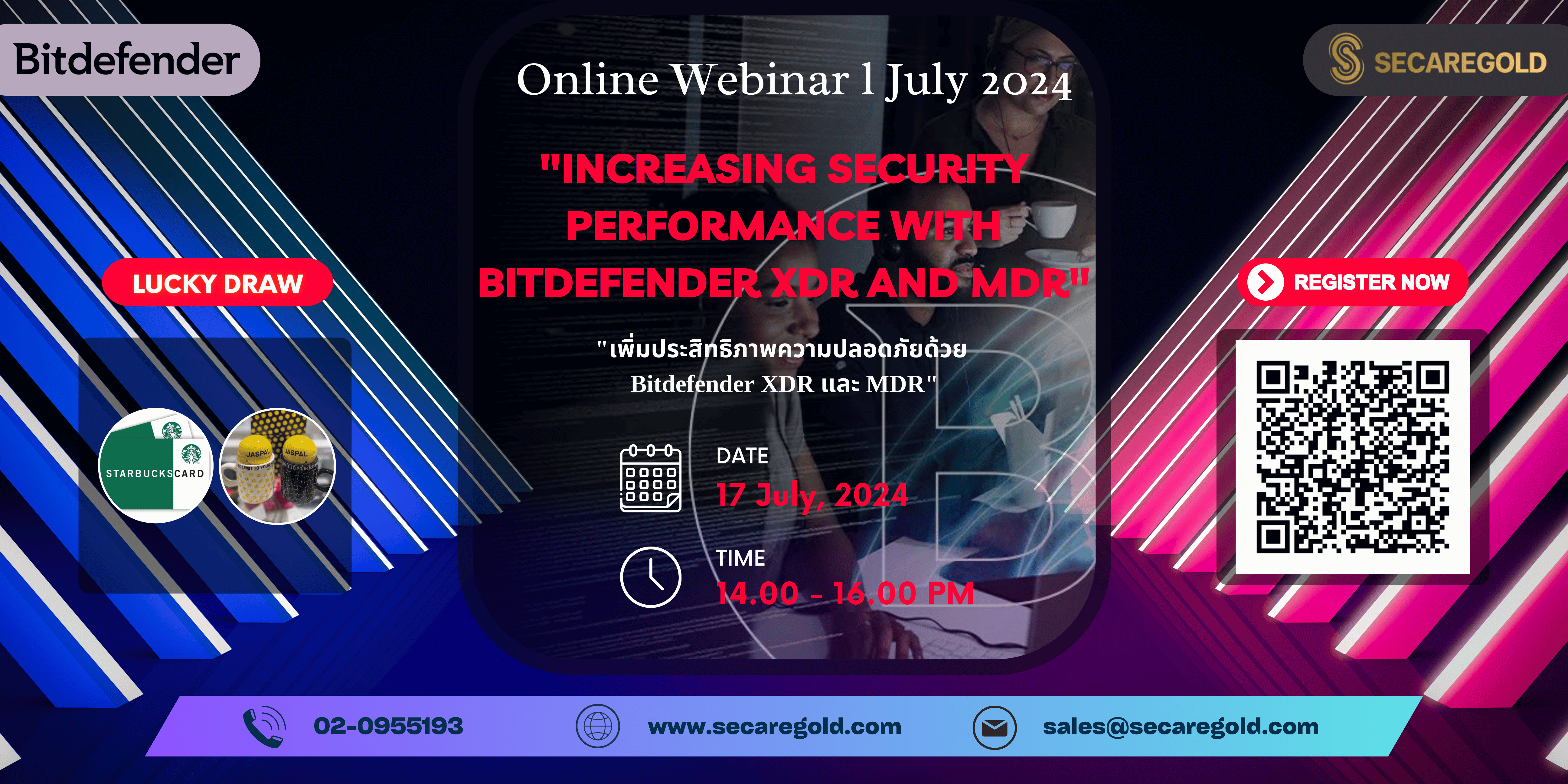 SECAREGOLD ร่วมกับ BITDEFENDER ขอเชิญลู กค้าทุกท่าน เข้าร่วมงานสัมมนาออนไลน์ในหั วข้อ "Increasing security performance with BITDEFENDER XDR and MDR"