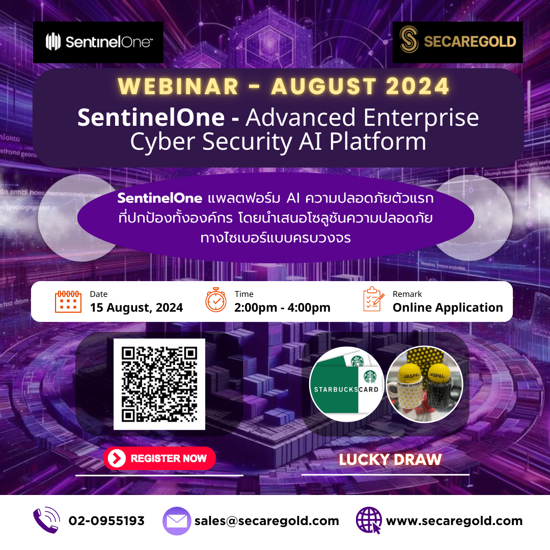 SECAREGOLD ร่วมกับ SENTINEL ONE ขอเชิญลูกค้าทุกท่าน เข้าร่วมงานสัมมนาออนไลน์ในหัวข้อ "SentinelOne - Advanced Enterprise Cyber Security AI Platform"