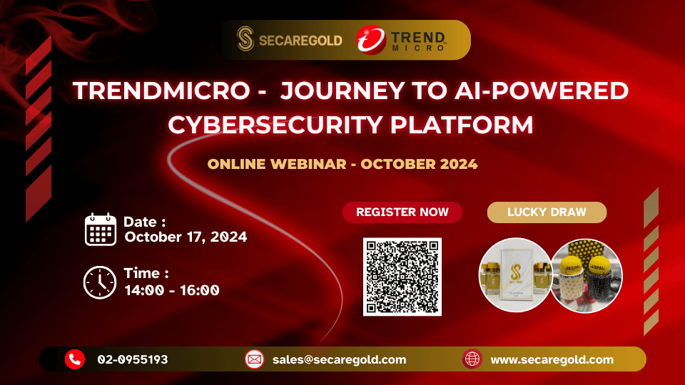 SECAREGOLD ร่วมกับ TRENDMICRO ขอเรียนเชิญผู้ปฏิบั ติงานด้าน IT Security ทุกท่าน เข้าร่วมงานสัมมนาออนไลน์ในหั วข้อ "TRENDMICRO - Journey to AI-Powered Cybersecurity Platform" เพื่ออัปเดตแนวโน้มด้ านภัยคุกคามและความมั่นคงปลอดภั ยทางไซเบอร์ รวมไปถึงการวางกลยุทธ์เพื่อรั บมือกับความเสี่ยงใหม่ในยุคดิจิ ทัล พร้อมกับยกระดับการป้องกั นความเสี่ยงด้วยประสิทธิภาพ AI และ Sensor การตรวจจับภัยคุกคามแบบรอบด้าน