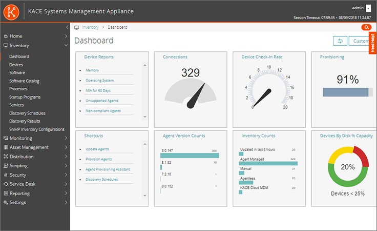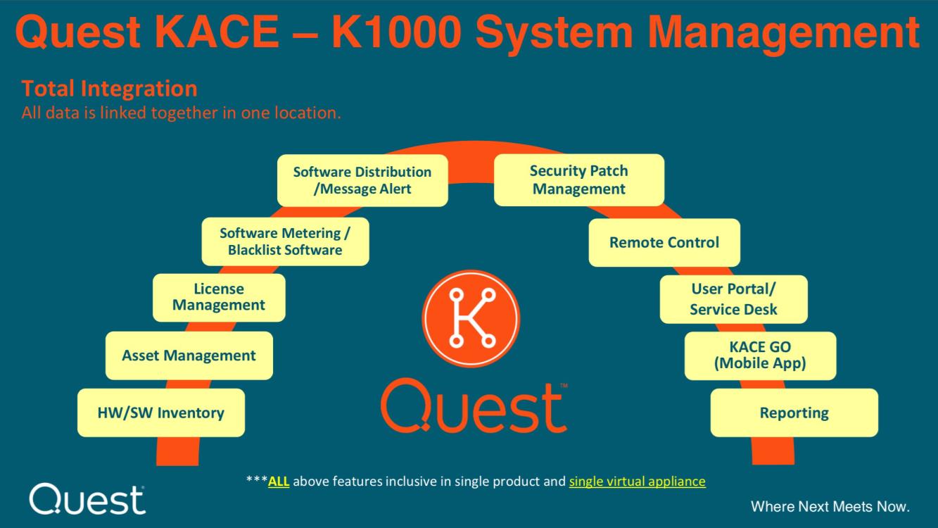 Comprehensive IT systems management for any network-connected device. The KACE® Systems Management Appliance by Quest® helps you fulfill all your endpoint management needs. This comprehensive solution provides automated endpoint-related administrative tasks, inventory of all hardware and software, patch management software for mission-critical applications and operating systems, reduced risk of a breach and guaranteed software license compliance.