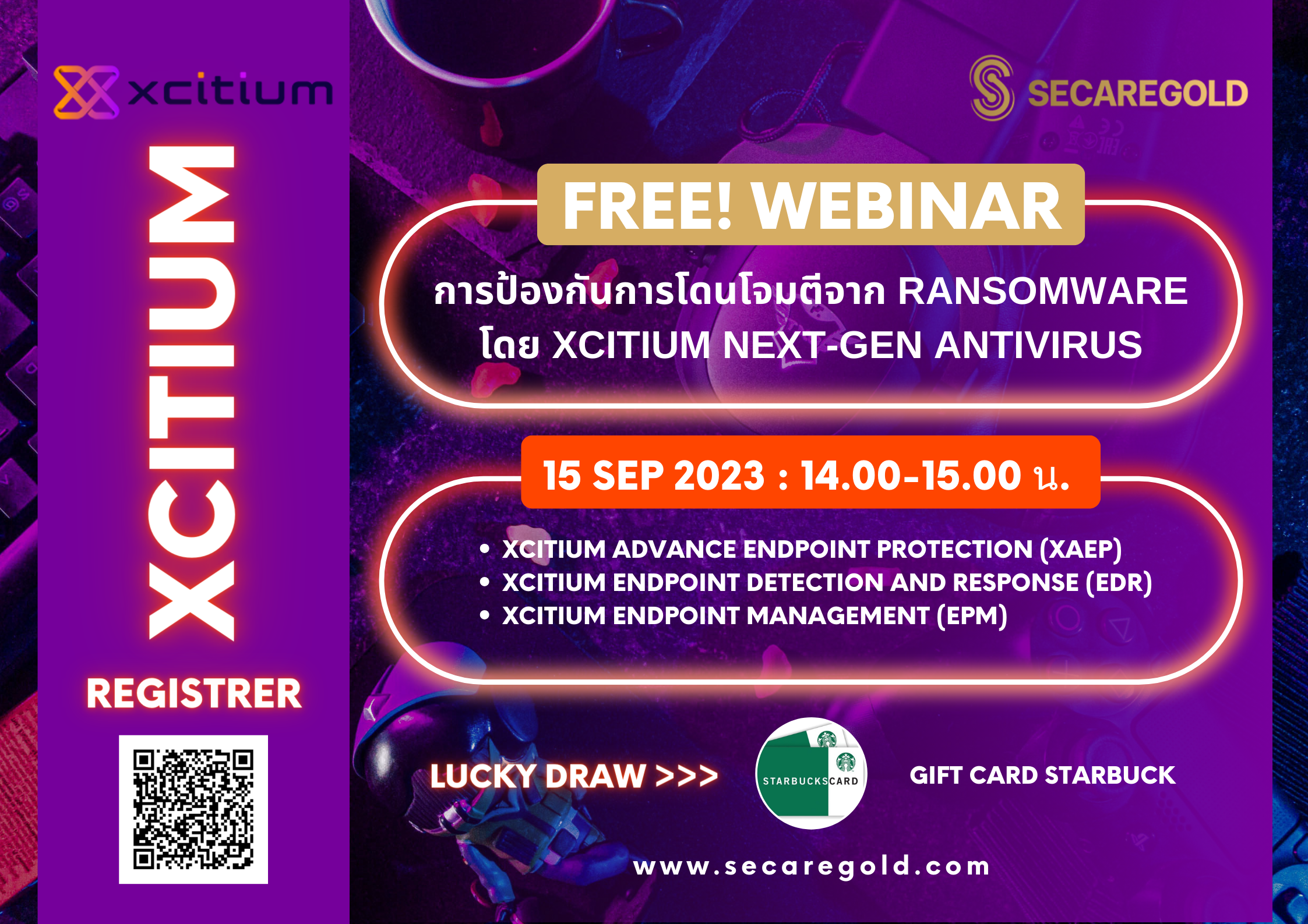 SECAREGOLD ร่วมกับ XCITIUM Thailand ขอเชิญลูกค้าทุกท่าน เข้าร่วมงานสัมมนา Online Webinar ในหัวข้อ “การป้องกันการโดนโจมตีจาก RANSOMWARE โดย XCITIUM Next-Gen Antivirus” โดยมีการนำเสนอเทคโนโลยีใหม่ๆ ของ Antivirus XCITIUM >>>
