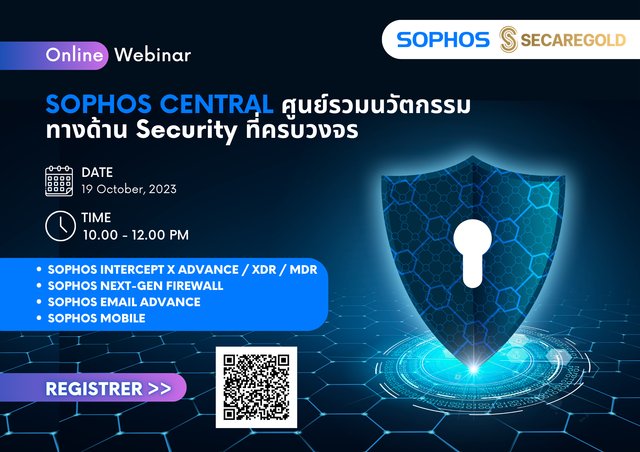 SECAREGOLD ร่วมกับ SOPHOS Thailand และ IT Green ขอเชิญลูกค้าทุกท่าน เข้าร่วมงานสัมมนาออนไลน์ในหัวข้อ “SOPHOS Central ศูนย์รวมนวัตกรรมทางด้าน Security ที่ครบวงจร” โดยมีการนำเสนอโปรดักส์ทั้งหมดของ SOPHOS ดังนี้