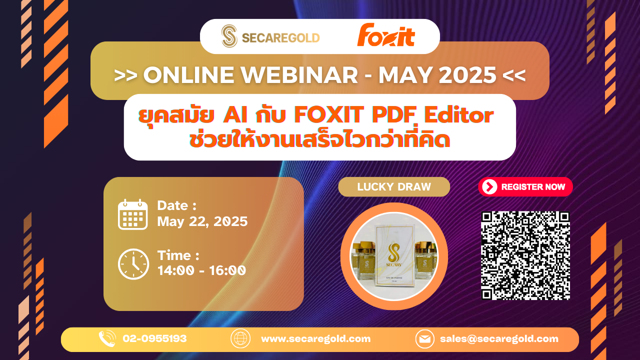 SECAREGOLD ร่วมกับ FOXIT ขอเรียนเชิญผู้ปฏิบัติ งานด้าน IT ทุกท่าน เข้าร่วมงานสัมมนาออนไลน์ในหั วข้อ "ยุคสมัย AI กับ FOXIT PDF Editor ช่วยให้งานเสร็จไวกว่าที่คิด" เพื่อรียนรู้เทคนิคการทำงานผ่าน Foxit PDF Editor ที่จะช่วยให้การทำงานของคุณง่ายขึ้น โดยเป็นการทำงานร่วมกันบนเอกสาร PDF แบบ Real-time นำเสนอฟีเจอร์ใหม่ล่าสุดที่ช่วยเพิ่มประสิทธิภาพการทำงาน และเทคนิคการใช้งานขั้นสูงที่คุณอาจไม่เคยรู้