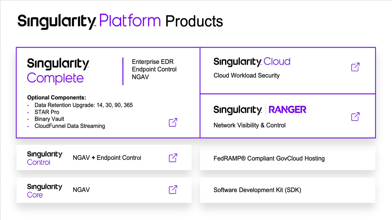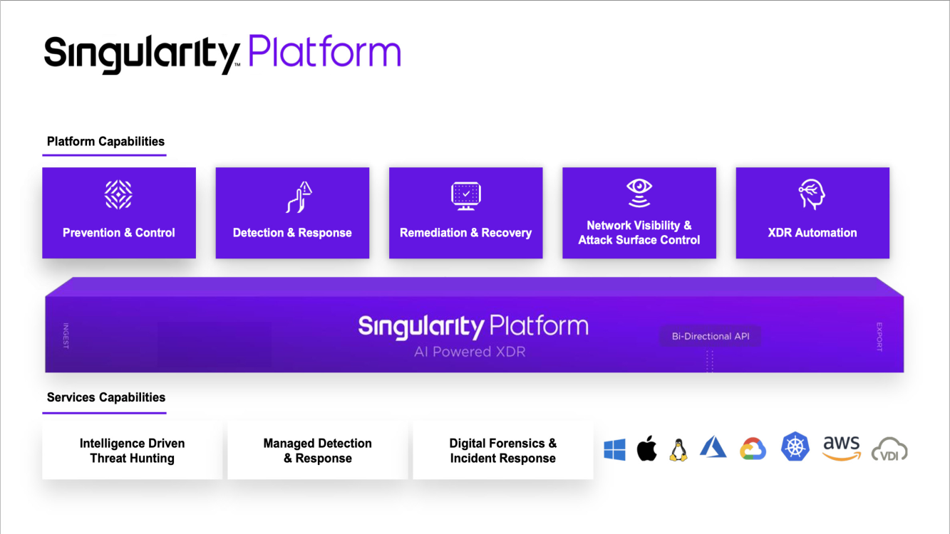 Singularity delivers differentiated endpoint protection, endpoint detection and response, IoT security, cloud security, and IT operations capabilities - consolidating multiple existing technol- ogies into one solution. We offer resource efficient, autonomous “Sentinel” agents for Windows, Mac, Linux, and Kubernetes and support a variety of form factors including physical, virtual, VDI, customer data centers, hybrid data centers, and cloud service providers.