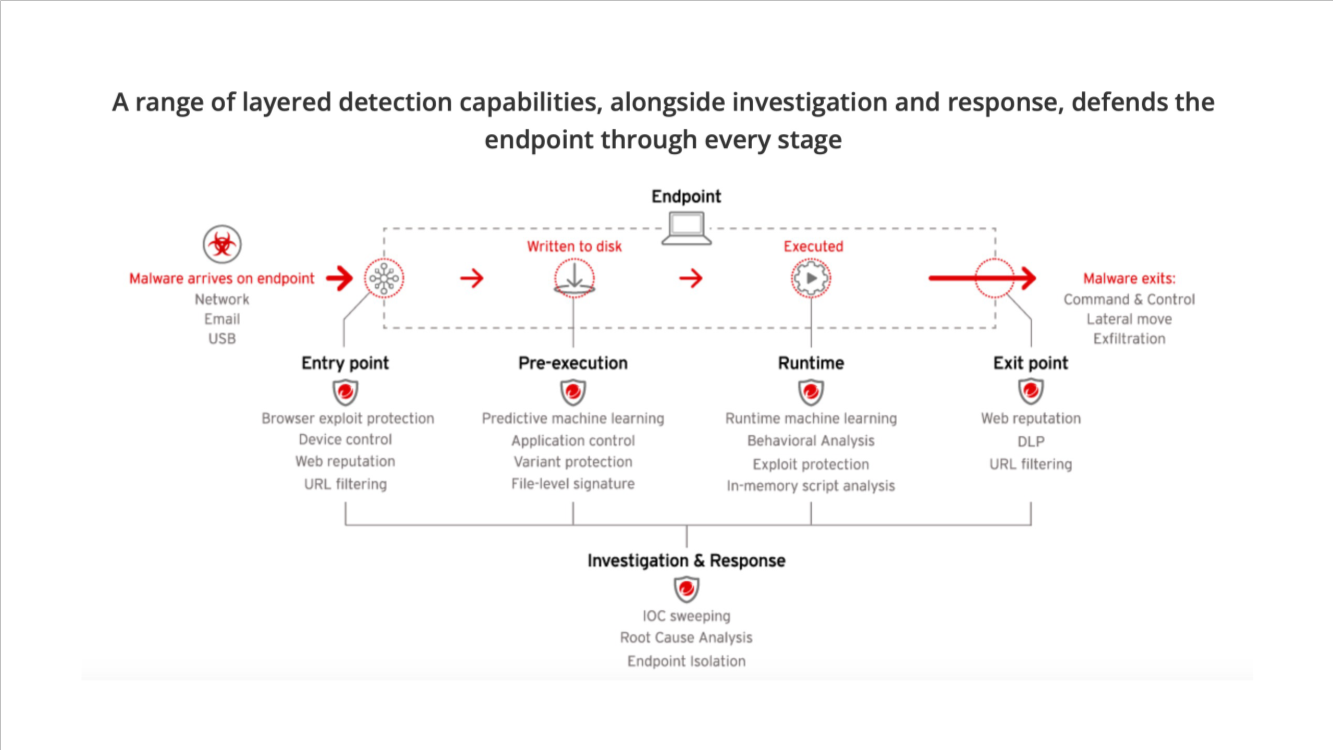 Malware and ransomware protection : Defends endpoints against malware, ransomware, malicious scripts, and more. With advanced protection capabilities that adapts to protect against unknown and stealthy new threats.