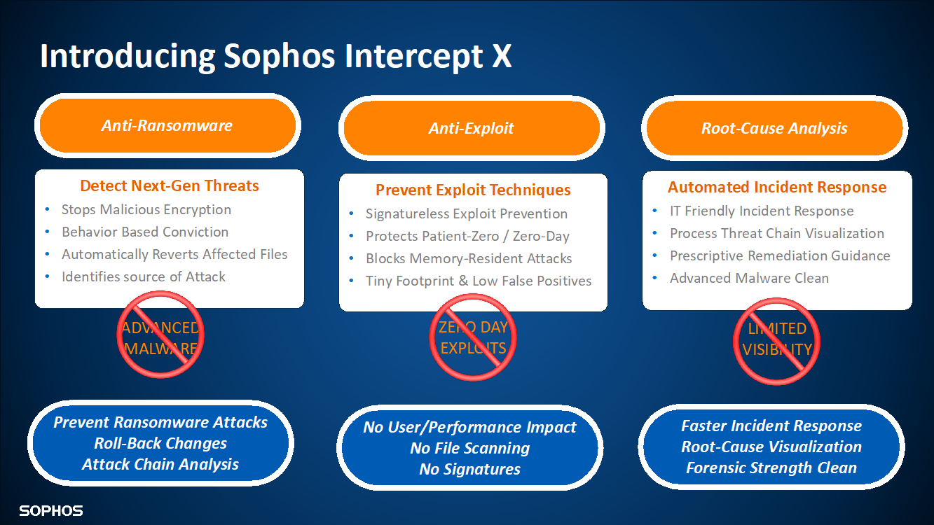 Sophos Intercept X ใช้แนวทางการป้องกันเชิงลึกที่ครอบคลุมในการป้องกันเครื่องปลายทาง แทนที่จะอาศัยเทคนิคความปลอดภัยหลักเพียงอย่างเดียว วิธีการเพิ่มชั้นการป้องกันโดยผสมผสานเทคนิคสมัยใหม่และแบบดั้งเดิมเข้าด้วยกันเพื่อหยุดยั้งภัยคุกคามที่หลากหลายที่สุด