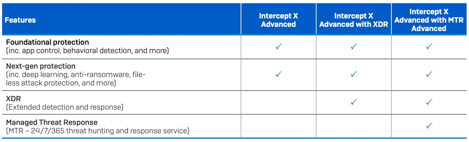 Intercept X Advanced, Intercept X Advanced พร้อม XDR, Intercept X Advanced พร้อม MTR Sophos Intercept X เป็นอุปกรณ์ป้องกันปลายทางที่ดีที่สุดในโลก มันหยุดภัยคุกคามความปลอดภัยทางไซเบอร์ล่าสุดด้วยการผสมผสานระหว่าง AI การเรียนรู้เชิงลึก ความสามารถในการต่อต้านแรนซัมแวร์ การป้องกันการโจมตีจากช่องโหว่ และเทคนิคอื่นๆ